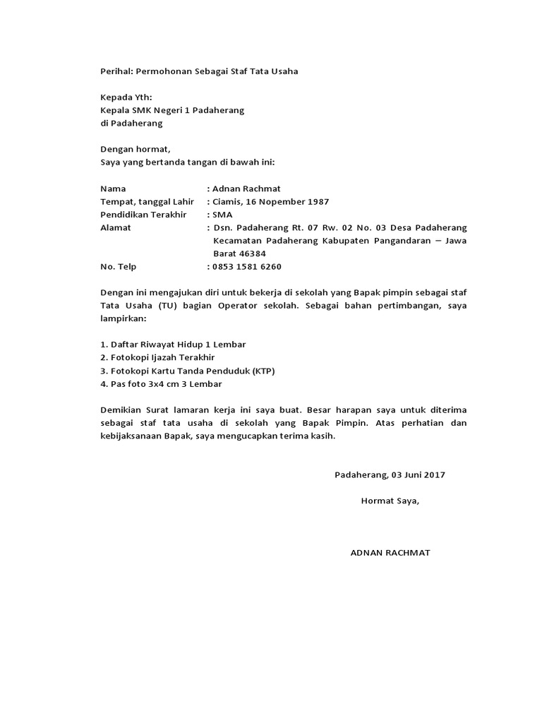 Bermaksud mengajukan lamaran kerja kepada (bapak/ibu) kepala (nama sekolah yayasan) untuk menjadi (jabatan yang dilamar) pada sekolah yang dipimpin. Find out the newest pictures of contoh surat pengalaman kerja operator sekolah here, so you can find the picture here simply. Yogyakarta, 18 oktober 2016 lampiran : Contoh surat lamaran kerja di sekolah swasta yayasan. Bagi anda para lulusan sarjana kependidikan yang idealnya bekerja menjadi tenaga pendidik di sekolah ini sebaiknya melihat contoh surat lamaran kerja ke sekolah sebelum anda mengajukan surat lamaran. Contoh surat lamaran kerja operator produksi adalah contoh lamaran pekerjaan terbaru yang akan admin bagikan pada kesempatan ini untuk anda yang ingin melamar kerja sebagai operator produksi. Kepala personalia nusa dua beach hotel & spa denpasar bali. File contoh sk surat penugasan operator sekolah ops sd pada link di atas yang bisa anda download ini disimpan di cloud storage google drive untuk menjamin keamanan file dari virus atau malware file otomastis melewati proses scan anti virus oleh sistem google drive. Saya mengirim surat lamaran kerja ini karena ini merupakan kesempatan besar bagi saya untuk memberikan yang terbaik bagi perusahaan anda. Ikuti panduan yang bisa kamu tiru agar dilirik oleh hrd! Contoh surat lamaran kerja untuk operator sekolah have an image from the other.contoh surat lamaran kerja untuk operator sekolah in addition, it will feature a picture of a sort that could be observed in the gallery of contoh surat lamaran kerja untuk operator sekolah. Contoh surat ini diharapkan dapat membantu anda dalam membuat surat yang dimaksud. Contoh surat lamaran kerja bagian tata usaha di sekolah contoh surat from i0.wp.com contoh surat lamaran kerja terbaik, lengkap beserta tips dan trik rahasia pembuatan surat lamaran kerja sehingga mudah mendapatkan pekerjaan.
